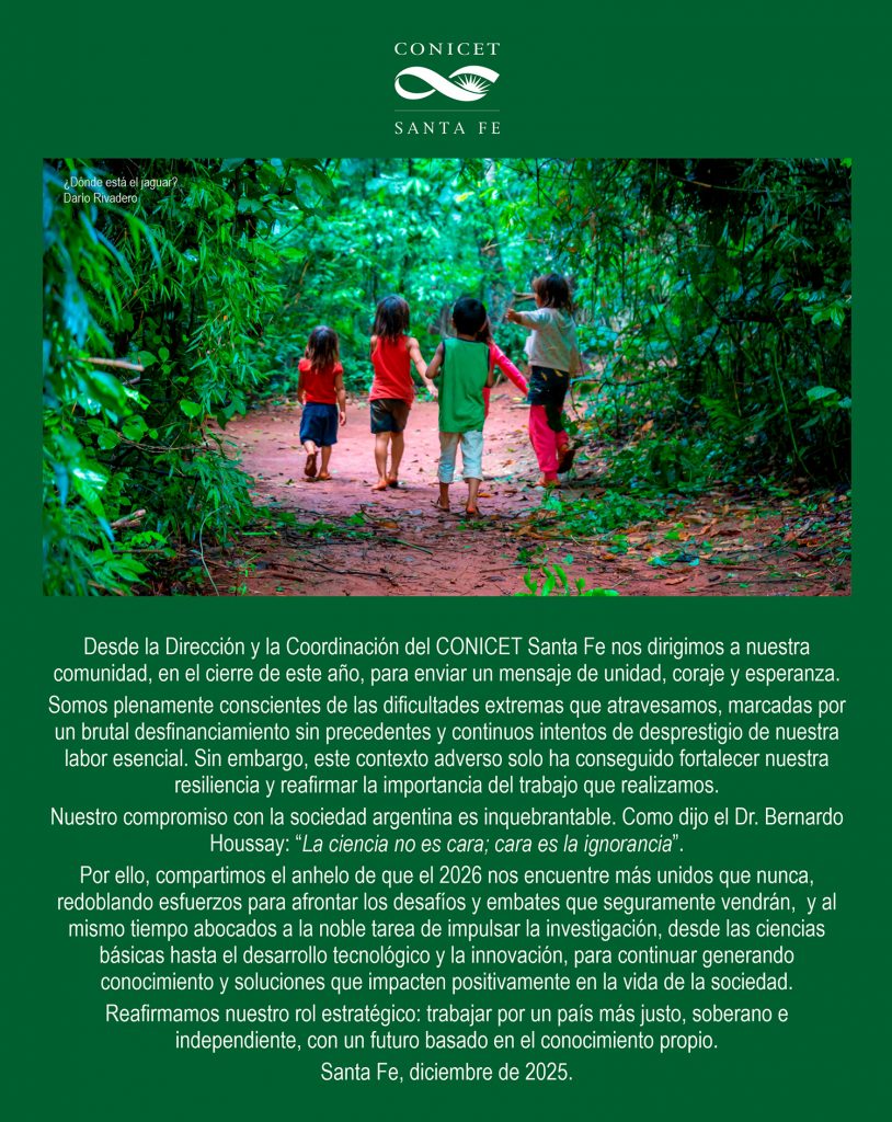 Desde la Dirección y la Coordinación del CONICET Santa Fe nos dirigimos a nuestra comunidad, en el cierre de este año, para enviar un mensaje de unidad, coraje y esperanza.