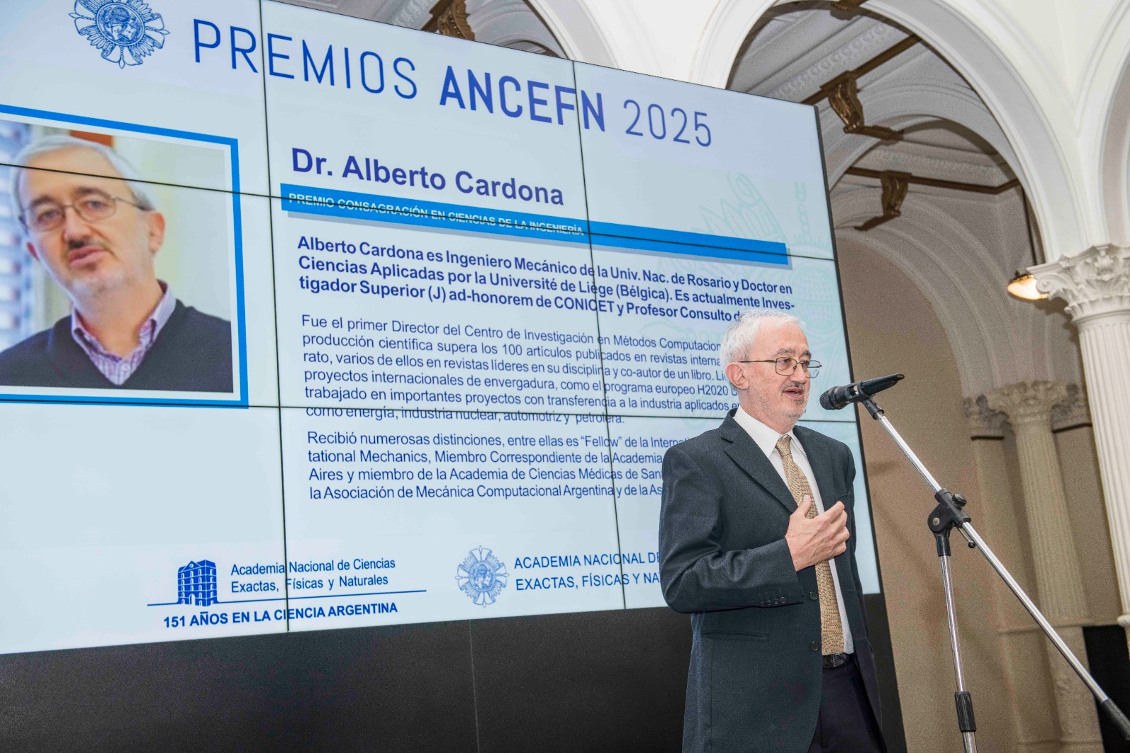 La Academia Nacional de Ciencias Exactas, Físicas y Naturales (ANCEFN) entregó los premios ANCEFN edición 2025 en una emotiva ceremonia celebrada en el Palacio Pizzurno, sede de la Secretaría de Educación. Estuvo encabezada por la investigadora del CONICET y presidenta de ANCEFN, Alicia Dickenstein. En esta oportunidad, se reconoció a investigadores del Consejo en las categorías Premios Estímulo y Premios Consagración en las áreas de Matemáticas, Física, Astronomía, Ciencias de la Ingeniería y Tecnología y Ciencias Químicas, de la Tierra y Biológicas.